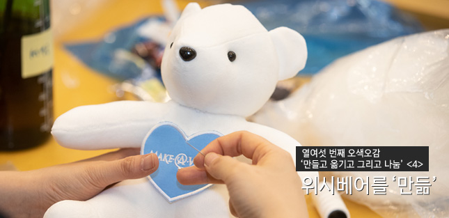 난치병 아동들의 소원을 이뤄주는 곰 인형 '위시베어' 만들기. 오래전에 네오위즈의 오색오감 활동으로 했던 프로그램으로 십여 년 만에 다시 만나게 되었습니다. 난치병 아동에게 희망을 주고 삶을 변화시켜 줄 수 있도록 소원을 이뤄주는 일에 작은 곰 인형이 큰 역할을 합니다. 소원성취 봉사자들이 난치병 아동과 팀이 되어 소원을 이뤄가는 과정에 아동과 처음 만나는 날 선물로 위시베어를 전달하게 됩니다. 위시베어가 병 치료로 힘든 시간을 견디는 아동들에게 친구가 되어주고, 소원을 이룰 수 있다는 희망을 주게 됩니다.