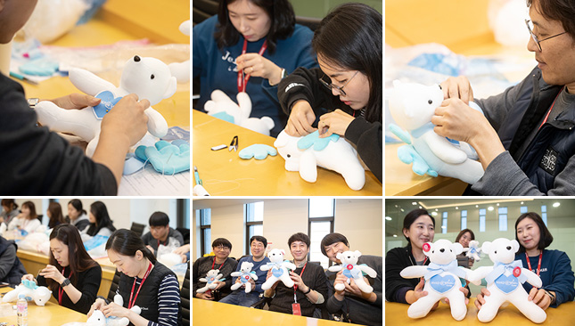 병과 싸우고 있는 아이들에게는 깨끗한 환경도 중요하겠죠. 위시베어 인형은 인체에 무해한 원단을 사용하고 있다고 하네요. 소독제로 손을 꼼꼼히 닦아주고 위시베어 만들기를 시작합니다. 우선 곰의 머리와 몸통에 솜을 채워 넣는데 너무 물렁하지도 단단하지도 않게, 아이들이 잡거나 안았을 때 폭신한 정도로 넣어주는 것이 좋습니다. 솜을 채운 다음 곰의 얼굴 모양을 잡아줄 눈과 코를 달아줍니다. 눈을 어느 위치에 달아 주는지 실을 어떤 강도로 당겨주는지에 따라 얼굴 모양이 좌우됩니다. 코 달기까지 마친 후에 머리에 솜을 더 채워 넣고 얼굴 모양을 다시 잡아주면 머리가 완성됩니다. 이제 몸통과 머리를 이어야 하는데 참여자분들이 가장 어려워한 부분이기도 합니다. 한 바퀴 바느질을 하고 나면 곰의 얼굴이 정면이 아닌 다른 곳을 보고 있기 일쑤입니다. 바느질하기 편한 위치가 아니어서 더 어려운 느낌입니다. 여러 번 수정하기도 하면서 바느질을 하고 나니 어느덧 곰 모양을 갖추게 되었습니다.
