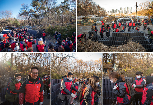 연탄을 나르기에 앞서 조끼를 입고 토시와 장갑을 챙겨 활동 준비를 합니다. 연탄 나르기가 열네 번째 겨울을 맞이하다 보니 여러 번 참여했던 직원들이 많아 준비과정이 익숙합니다. 총 6천장의 연탄이 갈 곳을 기다리며 쌓여 있습니다. 파이팅을 외치고, 3개 조로 나뉘어 연탄 배달을 시작합니다. 경사가 심하거나 집들이 멀리 떨어져 있지 않아 모두 지게로 배달을 합니다. 1년 만에 느껴보는 지게에 올라간 연탄의 무게가 새삼 더 무겁게 느껴집니다. 누가 더 많이 싣고 나르나 경쟁 아닌 경쟁이 되기도 하지만 무엇보다 중요한 것은 봉사자의 안전과 연탄의 안전이겠죠. 꾸준히 나르고 나르고 또 나릅니다. 계속 돌아오는 빈 지게에 쉴 새 없이 연탄을 실어주다 보면 연탄 더미가 눈에 띄게 줄어갑니다.