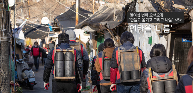눈은 오지 않았지만 올겨울 들어 가장 추웠던 날, 서울시 강남구 개포동의 구룡마을에 네오위즈 임직원 백여 명이 모였습니다. 네오위즈 오색오감의 대표 활동인 연탄을 나르기 위해서입니다. 아직도 추운 겨울을 지내기에 연탄이 꼭 필요한 분들이 많이 있습니다. 저소득층 가정에서는 한 장에 800원까지 오른 연탄을 살 돈이 부담되는 것도 문제지만 무거운 연탄을 차가 가지 못하는 집까지 옮기는 것도 비용이 발생하여 더욱 부담되는 일이라고 합니다. 네오위즈에서는 해마다 연탄을 지원하고 배달 봉사 활동을 하고 있습니다. 이번에 찾아간 곳은 몇 년 전 함박눈이 펑펑 오던 날 연탄을 날랐던 기억이 있는 구룡마을이었습니다.